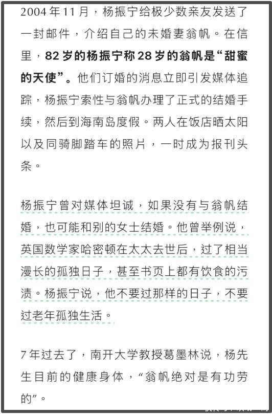 杨先生以前接受采访时就说过,他觉得他和翁帆的结合,以后的人看了会觉得是段挺美的故事。